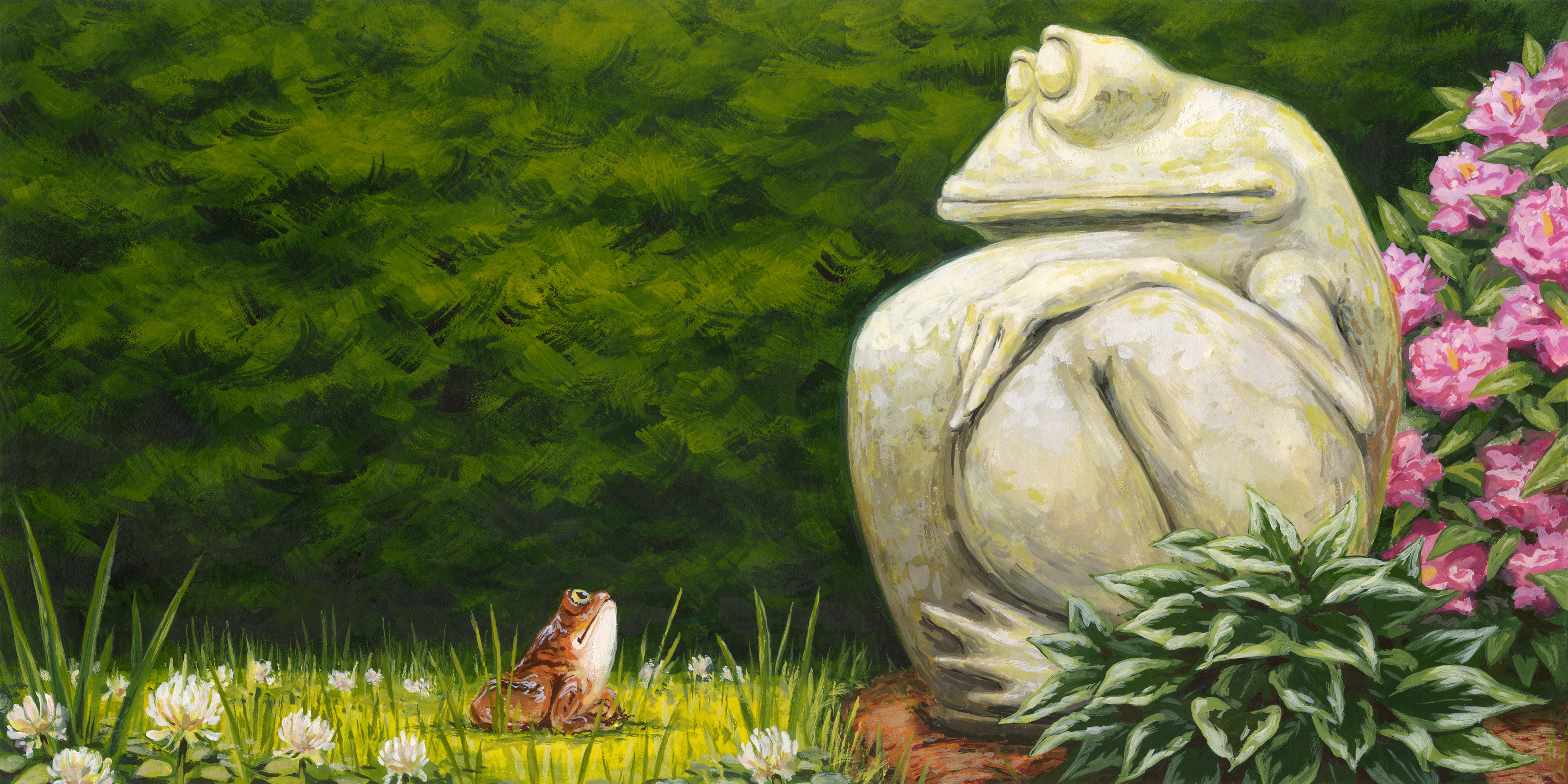 A young frog comes across a statue while exploring someone's back garden. Unfortunately, he doesn't know what a statue is, and thinks this enormous frog is simply being rude and ignoring him.